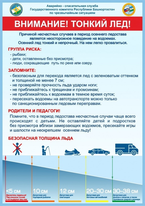 Администрация муниципального района Бижбулякский район Республики Башкортостан Государственный комитет РБ по чрезвычайным ситуациям и ГБУ Аварийно-спасательная служба РБ напоминает гражданам района, что причиной гибели на водных объектах в период осеннего ледостава является элементарное несоблюдение правил безопасности поведения на льду. Осенний лёд тонкий и непрочный, на нём легко провалиться.