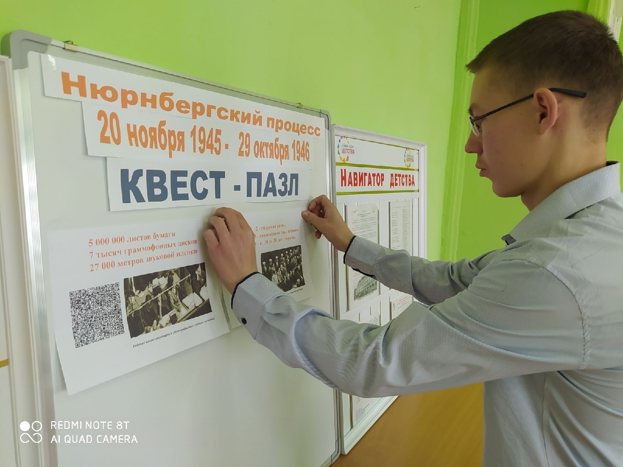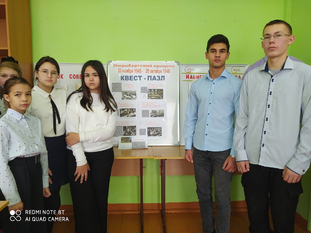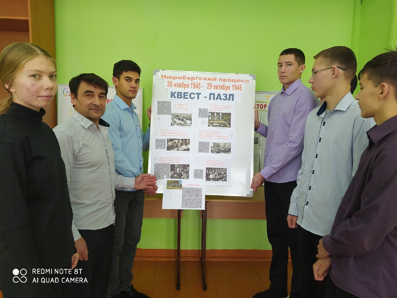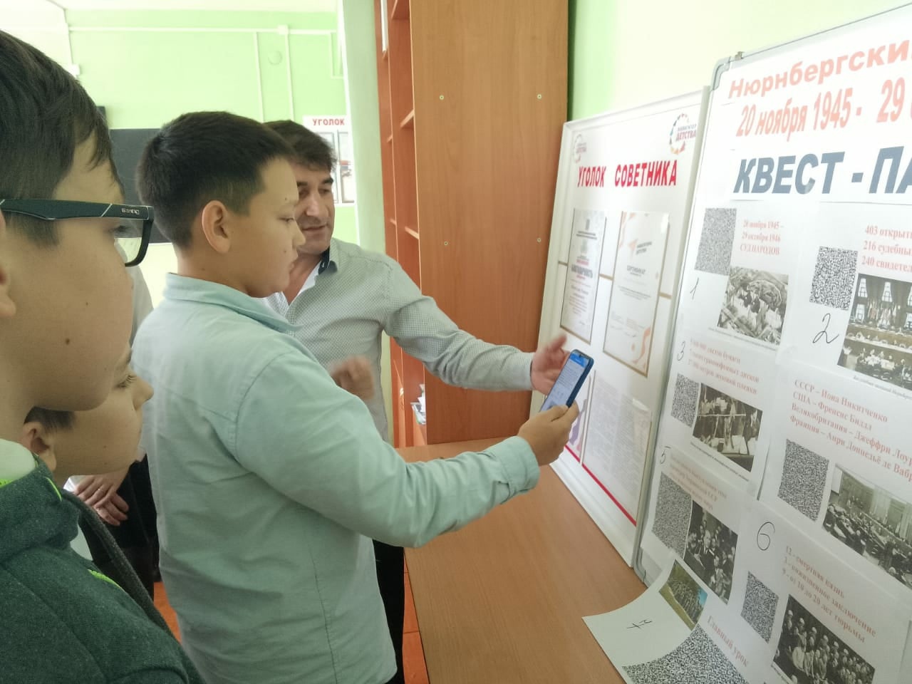 В рамках проведения тематического мероприятия ребята посмотрели видеоурок «День начала Нюрнбергского процесса» и собрали квест-пазл исторического события мирового масштаба, фактически определившего дальнейший ход истории всего мира. Для этого ученики находили размещенные в школе постеры, содержащие разрозненные информационные фрагменты с QR-кодами, получали по QR-кодам дополнительную информацию, соединяли информационные блоки в логическую последовательность и в результате получили полную информацию о событии.