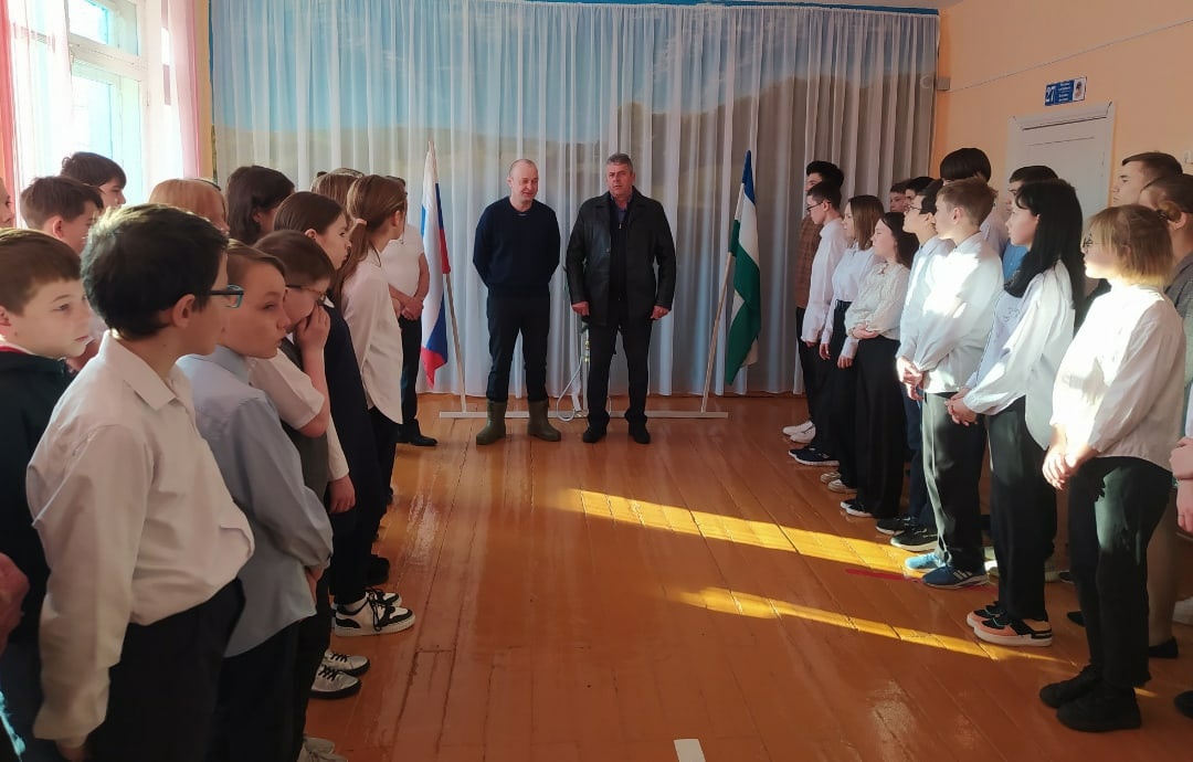 Воспитательно-патриотическое мероприятие было организовано при участии главы СП Михайловский сельсовет Никитина С.А. Выпускник нашей школы приехал домой в отпуск из зоны СВО, посетил родную школу, выступил на линейке перед учениками и учителями.