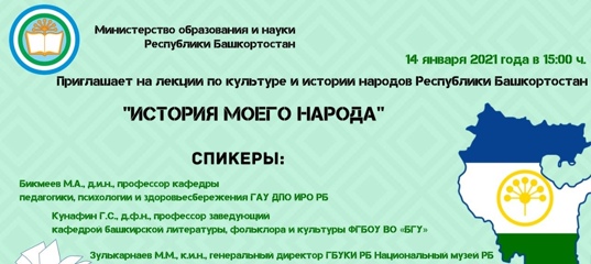 Министерство образования и науки Республики Башкортостан в рамках проведения тематических новогодних мероприятий 14 января 2021 года проводит лекции для школьников по культуре и истории народов Республики Башкортостан "История моего народа" в онлайн-форма